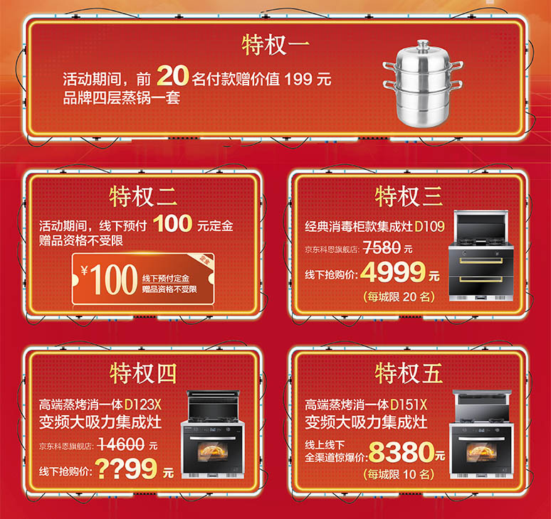科恩電器一直倡導“樂享智慧烹飪”,本次活動也將以“集成智慧廚房”為宗旨,將活動產品鎖定與高端產品上。據(jù)悉,本次集成灶十大品牌、廚電行業(yè)十大品牌科恩電器攜手京東商城五一狂歡活動,只為讓一直以來支持科恩電器的消費者花最少的錢購到心儀的集成灶,五大特權優(yōu)惠、搶名額、搶補貼,超劃算的活動肯定讓你心動。