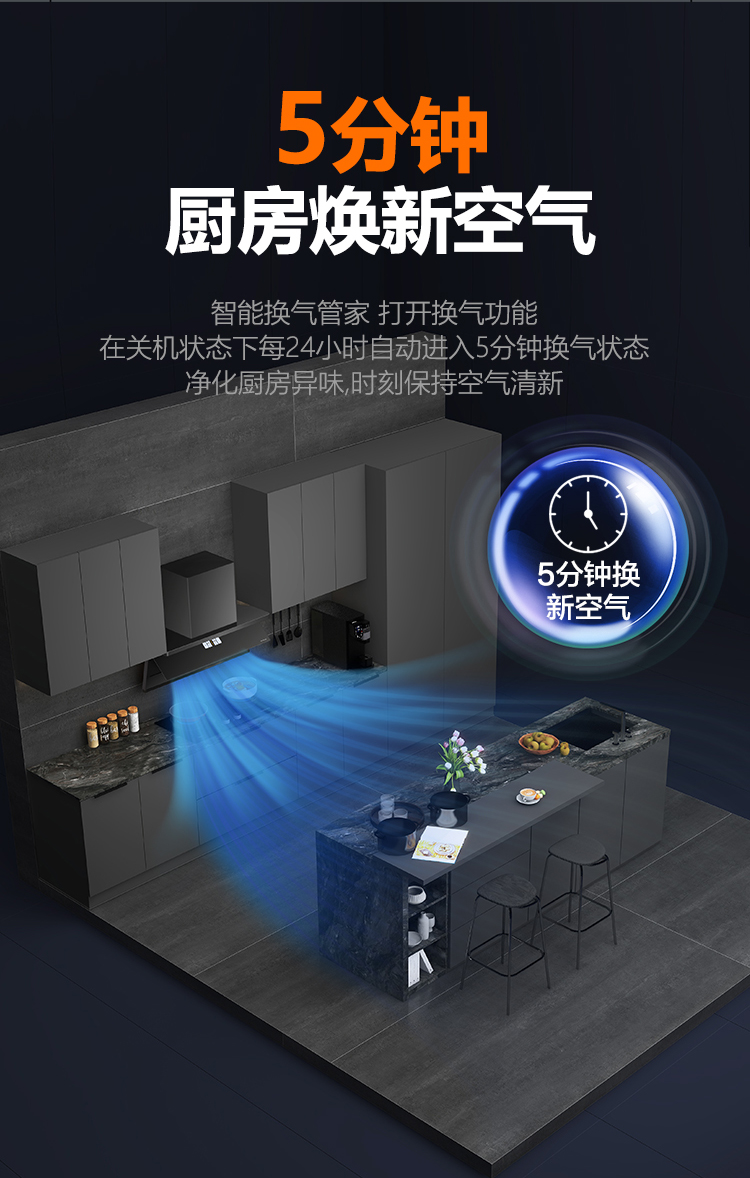 28m³/min 颶風吸力,爆炒油煙瞬凈。1060Pa 強風壓,無懼公共煙道阻力。讓廚房空氣時刻清新。900mm 開合攏煙屏+58°黃金開合角形成覆蓋雙灶的三角攏煙腔,緊鎖油煙不逃逸,低空近吸讓油煙未升騰即被鎖定,從此告別油煙撲臉的尷尬。