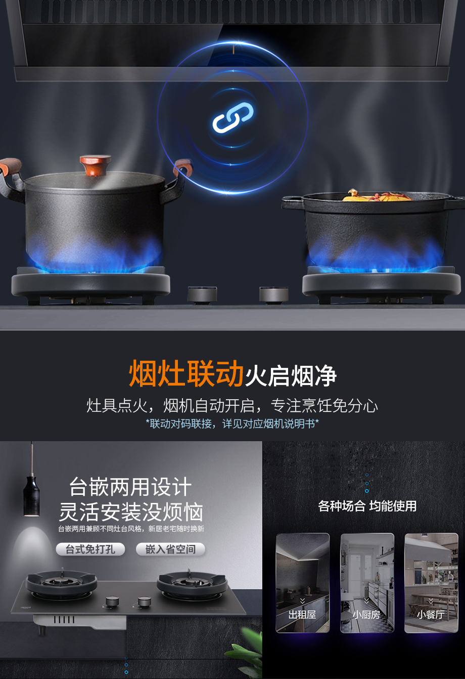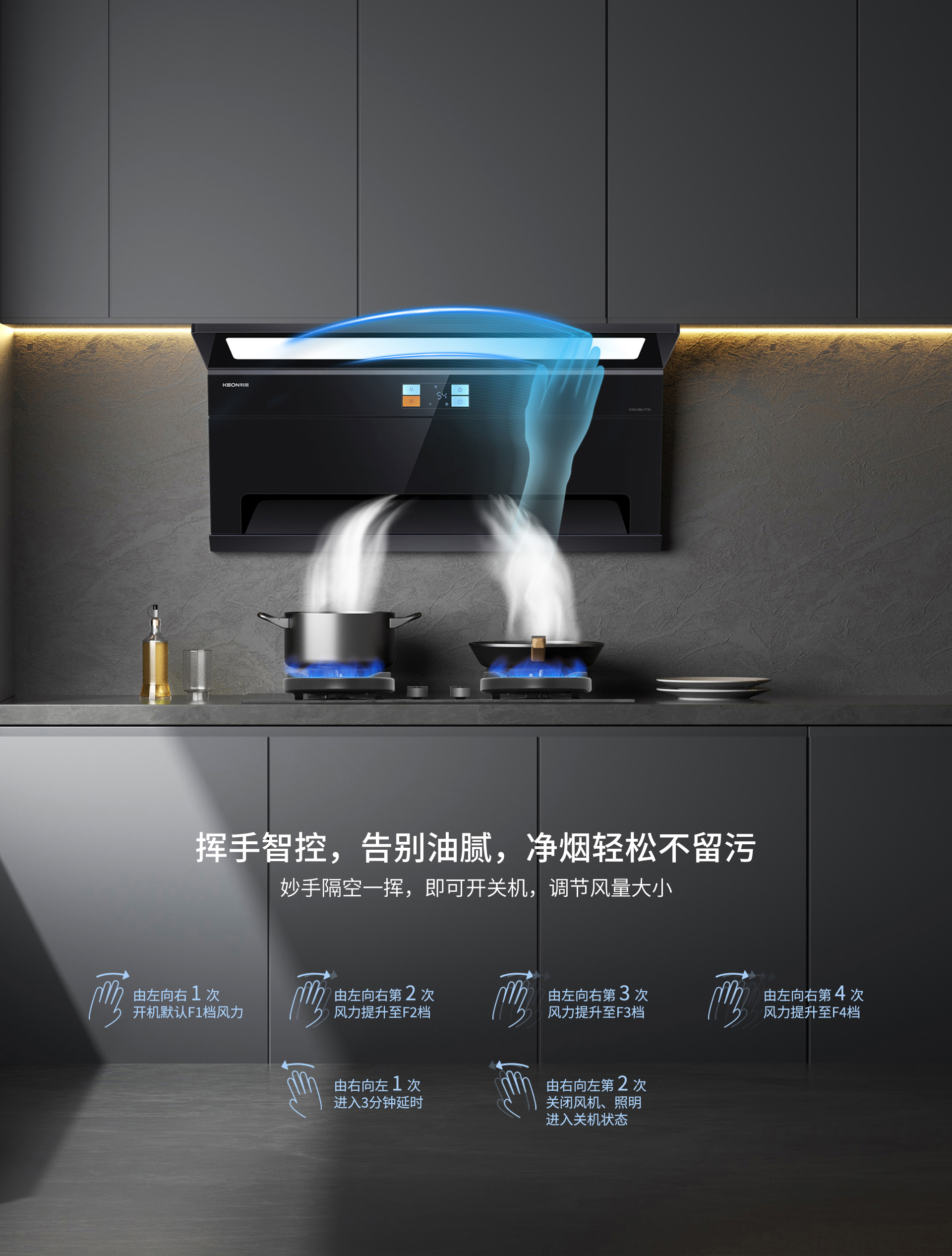 智能操控,告別油膩接觸。揮手即能掌控,雙手不沾油污,隔空一揮開關機、調風量,模塊化彩屏觸摸鍵,老人也能輕松操作,煙灶聯動,火起煙凈,打造智能便捷的廚居生活。